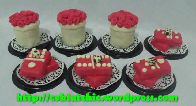 Minicake kartu domino dan dadu, minicake pot bunga Topper dan pelapis terbuat dari coklat bukan fondant atau sugar icing Posted with WordPress for BlackBerry. Share this: Share on Facebook (Opens in new window) Facebook Like Loading... Related