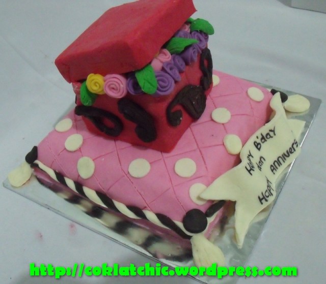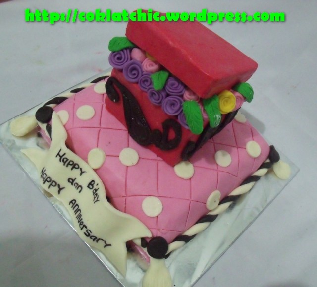 Cake bantal dan box of flower Harga mulai dari Rp 350 ribu, terbuat dari crafted cake dilapisi oleh coklat bukan fondant atau sugar icing Share this: Share on Facebook (Opens in new window) Facebook Like Loading... Related