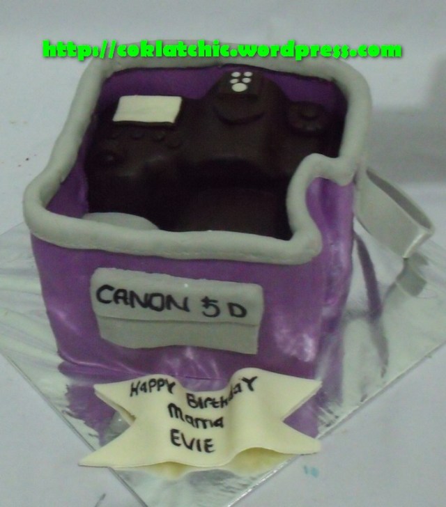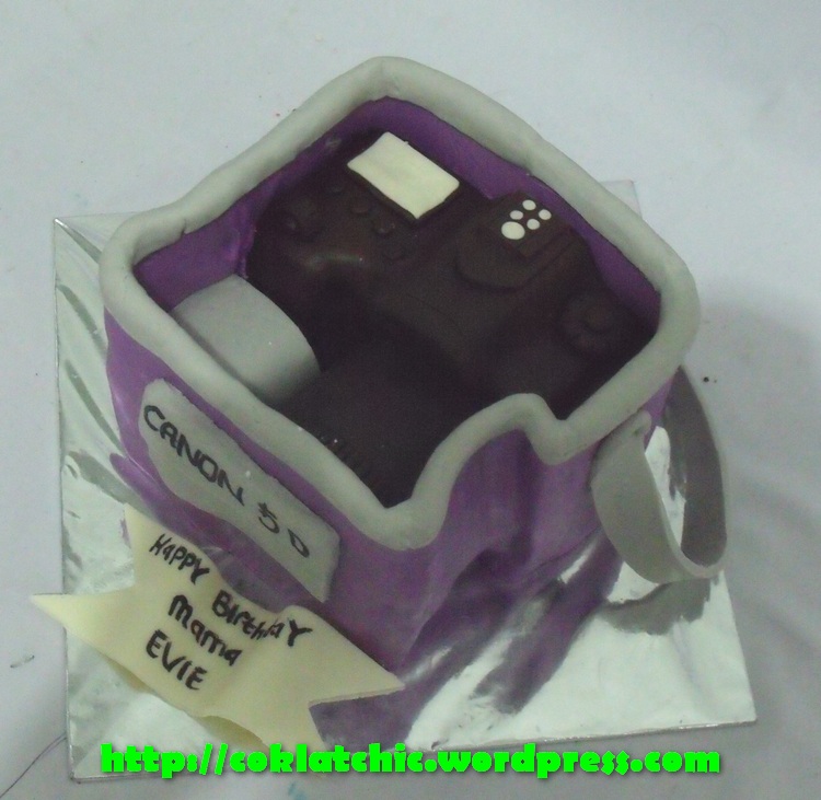 Cake Camera Canon 5D dalam tas – MAMA EVIE Harga kue model ini mulai dari Rp 300 ribu,begitu tas dibuka bentuknya real kamera.Topper dan pelapis terbuat dari coklat bukan fondant atau sugar icing Posted with WordPress for BlackBerry. Share this: Share on Facebook (Opens in new window) Facebook Like Loading... Related