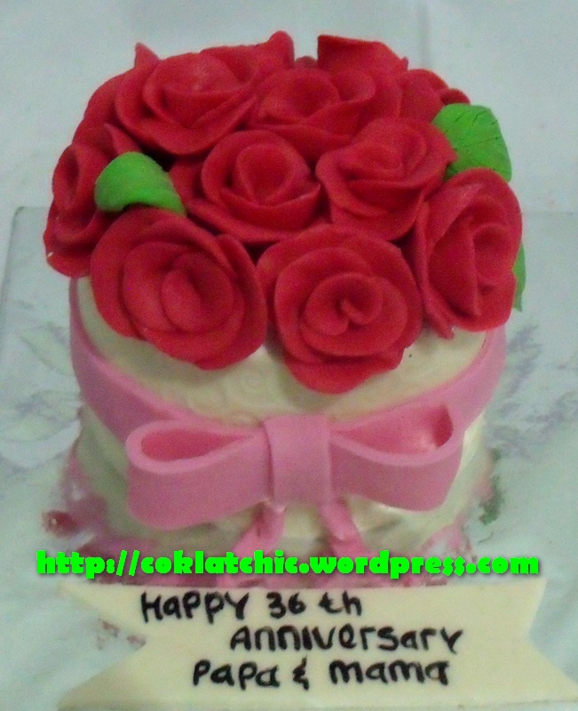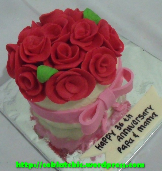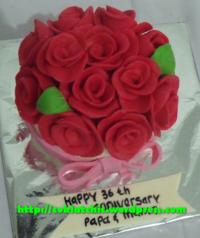 Buket bunga cake – ANNIVERSARY Harga kue model ini mulai dari Rp 125 ribu,topper dan pelapis terbuat dari coklat bukan fondant atau sugar icing Posted with WordPress for BlackBerry. Share this: Click to share on Facebook (Opens in new window) Facebook Like Loading... Related