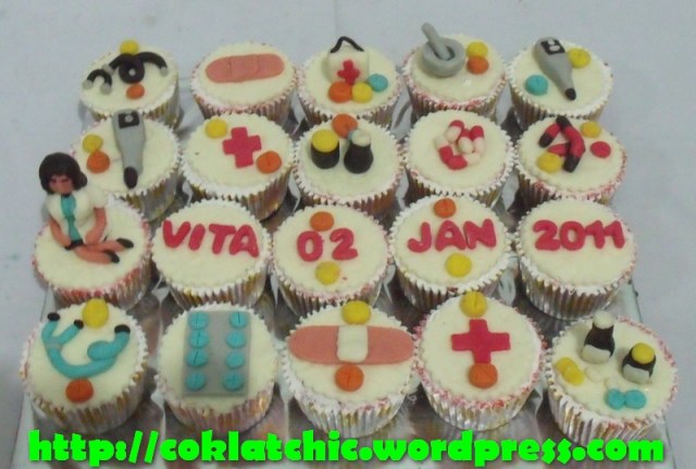 Cupcake dokter,cupcake alat-alat kesehatan dan cupcake obat-obatan – VITA Topper dan pelapis terbuat dari coklat bukan fondant atau sugar icing Posted with WordPress for BlackBerry. Share this: Share on Facebook (Opens in new window) Facebook Like Loading... Related