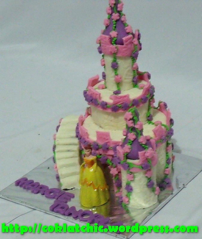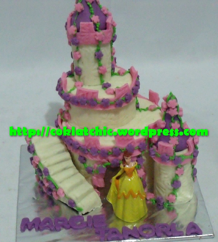 Princess Castle Cake – MARGIE TANORLA Harga kue model ini mulai dari Rp 200 ribu. Terbuat dari crafted cake,dilapisi coklat bukan fondant atau coklat. Posted with WordPress for BlackBerry. Share this: Share on Facebook (Opens in new window) Facebook Like Loading... Related
