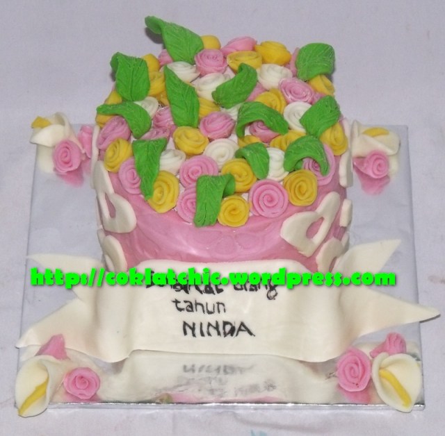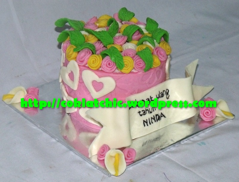 Buket bunga cake – NINDA Harga kue model ini mulai dari Rp 125 ribu,topper dan pelapis terbuat dari coklat bukan fondant atau sugar icing Posted with WordPress for BlackBerry. Share this: Share on Facebook (Opens in new window) Facebook Like Loading... Related