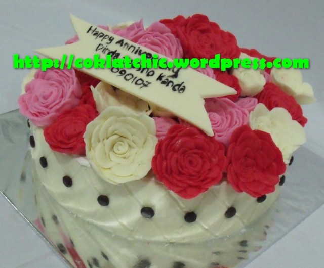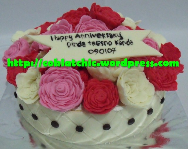 Cake Bunga untuk anniversary Harga kue bentuk ini mulai dari Rp 200 ribu,topper dan pelapis terbuat dari coklat bukan fondant atau sugar icing Posted with WordPress for BlackBerry. Share this: Click to share on Facebook (Opens in new window) Facebook Like Loading... Related