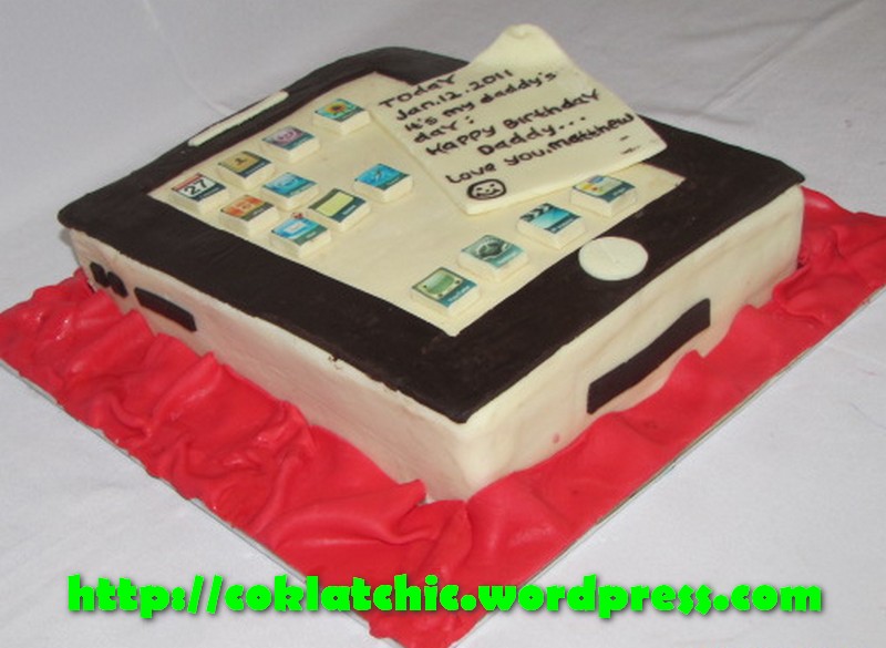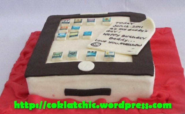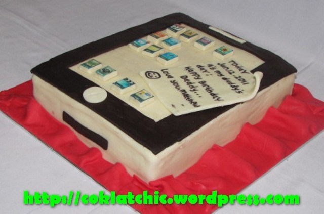 Kue Ipad Harga kue Ipad model ini dimulai dari Rp 300 ribu,topper dan pelapis terbuat dari coklat bukan fondant atau sugar icing Posted with WordPress for BlackBerry. Share this: Share on Facebook (Opens in new window) Facebook Like Loading... Related