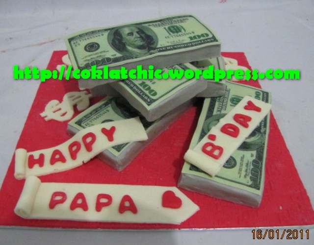 Kue tumpukan uang dollar – PAPA Harga Kue tumpukan uang dollar mulai dari Rp 300 ribu,topper dan pelapis terbuat dari coklat bukan fondant atau sugar icing Posted with WordPress for BlackBerry. Share this: Share on Facebook (Opens in new window) Facebook Like Loading... Related