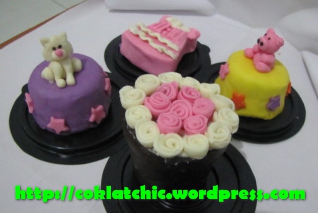 Minicake baju bayi,minicake pot bunga,minicake animal dan Cake castle princess Topper dan pelapis terbuat dari coklat bukan fondant atau sugar icing Posted with WordPress for BlackBerry. Share this: Share on Facebook (Opens in new window) Facebook Like Loading... Related