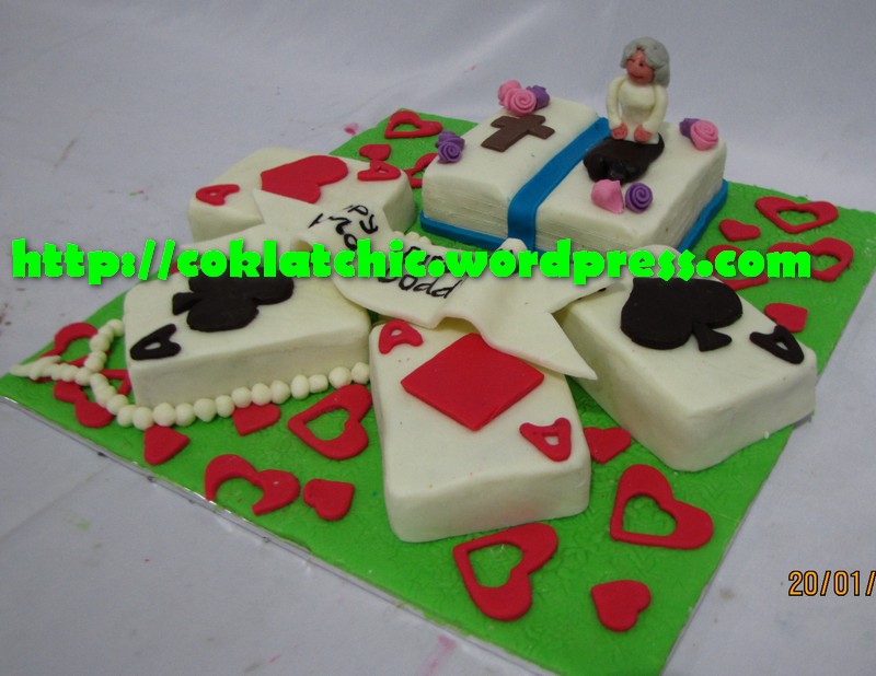Kue kartu remi Harga Kue kartu remi mulai dari Rp 125 ribu,dengan topper dan pelapis terbuat dari coklat bukan fondant atau sugar icing Posted with WordPress for BlackBerry. Share this: Share on Facebook (Opens in new window) Facebook Like Loading... Related
