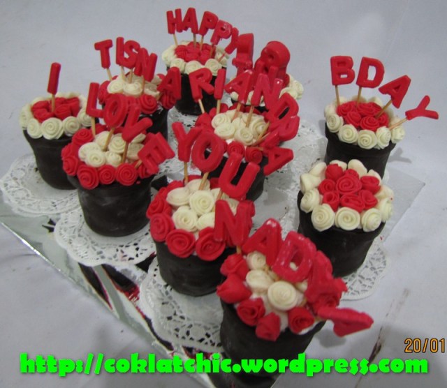 Minicake pot bunga – TISNA RIANDRA Topper dan pelapis terbuat dari coklat bukan fondant atau sugar icing Posted with WordPress for BlackBerry. Share this: Share on Facebook (Opens in new window) Facebook Like Loading... Related
