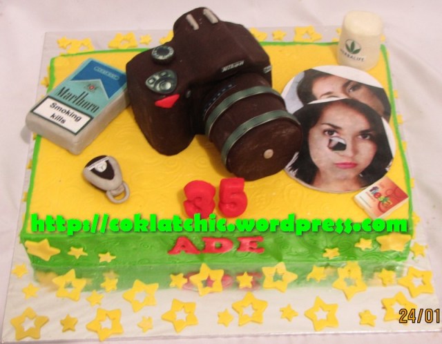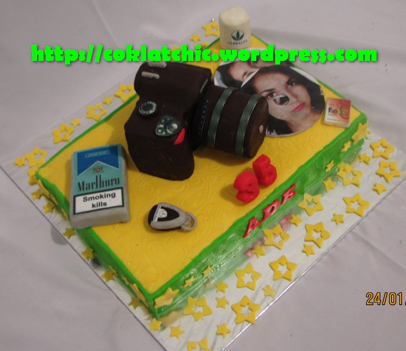 Kue ulang tahun dengan tema Cake kondom,Nikon,kunci mobil,rokok,VCD dan herbalife mulai dari harga Rp 500 ribu dengan topper dan pelapis terbuat dari coklat bukan fondant atau sugar icing