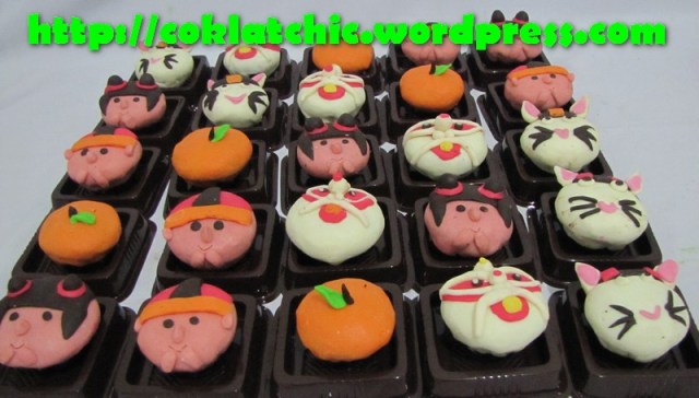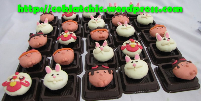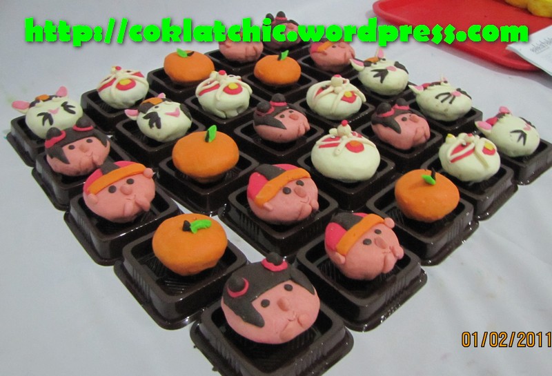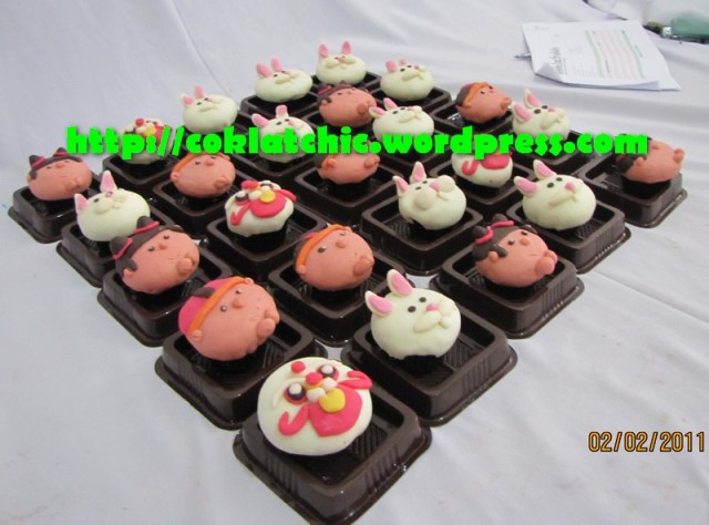 Minicupcake imlek,minicupcake barongsai,minicupcake jeruk,minicupcake kelinci Topper dan pelapis terbuat dari coklat bukan fondant atau sugar icing Posted with WordPress for BlackBerry. Share this: Click to share on Facebook (Opens in new window) Facebook Like Loading... Related