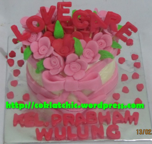 Cake buket bunga – Kel Pradham Wulung Kue Valentine dengan tema Cake buket bunga model ini mulai dari harga Rp 125 ribu Pelapis terbuat dari coklat bukan fondant atau sugar icing. Posted with WordPress for BlackBerry. Share this: Share on Facebook (Opens in new window) Facebook Like Loading... Related