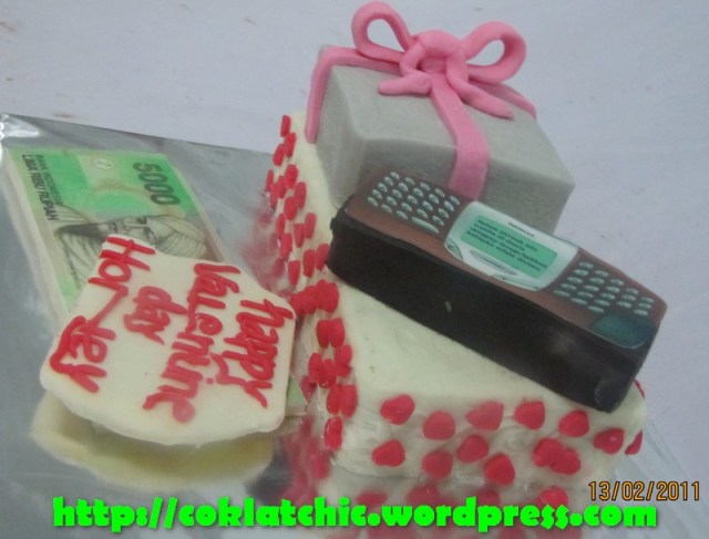 Valentine gift set cake Kue Valentine dengan tema Valentine gift set cake model ini mulai dari harga Rp 200 ribu Pelapis terbuat dari coklat bukan fondant atau sugar icing. Posted with WordPress for BlackBerry. Share this: Share on Facebook (Opens in new window) Facebook Like Loading... Related
