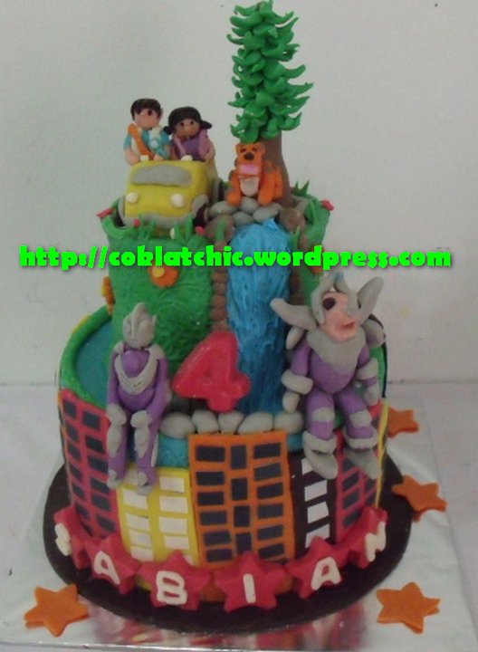 Kue ulang tahun dengan tema Cake Ultraman,Dora dan Diego model ini mulai dari harga Rp 300 ribu