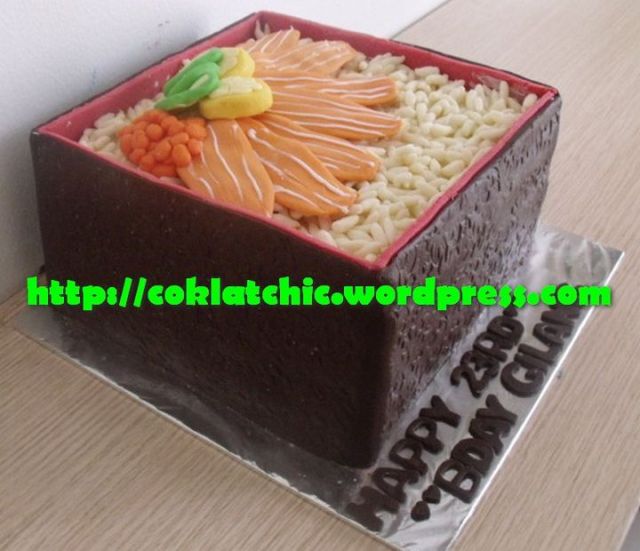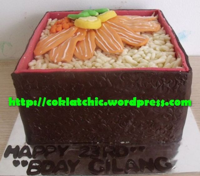 Cake bento – GILANG Kue ulang tahun dengan tema Cake bento model ini mulai dari Rp 300 ribu Terbuat dari kue yang dipahat,no styrofoam. Pelapis terbuat dari coklat bukan fondant atau sugar icing. Posted with WordPress for BlackBerry. Share this: Share on Facebook (Opens in new window) Facebook Like Loading... Related