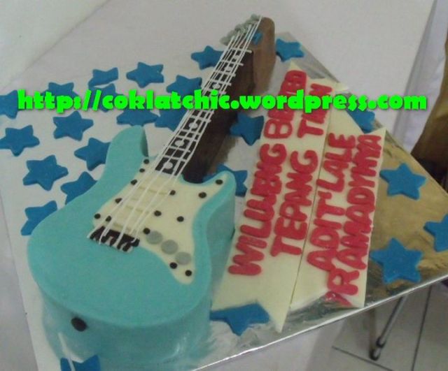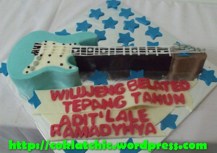 Cake Gitar – ADIT LALE RAMADYHYA Kue ulang tahun dengan tema Cake Gitar model ini mulai dari Rp 200 ribu Terbuat dari kue yang dipahat,no styrofoam. Pelapis terbuat dari coklat bukan fondant atau sugar icing. Posted with WordPress for BlackBerry. Share this: Click to share on Facebook (Opens in new window) Facebook Like Loading... Related