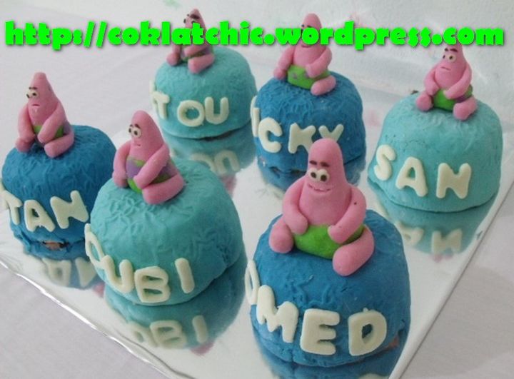 Minicake Patrick Terbuat dari kue yang dipahat,no styrofoam. Pelapis terbuat dari coklat bukan fondant atau sugar icing. Posted with WordPress for BlackBerry. Share this: Share on Facebook (Opens in new window) Facebook Like Loading... Related