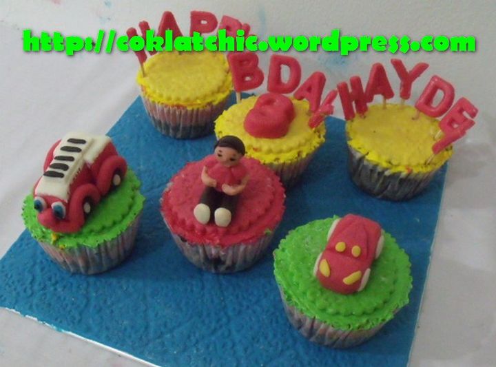 Cupcake set finley dan cars – HAYDEN Terbuat dari kue yang dipahat,no styrofoam. Pelapis terbuat dari coklat bukan fondant atau sugar icing. Posted with WordPress for BlackBerry. Share this: Share on Facebook (Opens in new window) Facebook Like Loading... Related