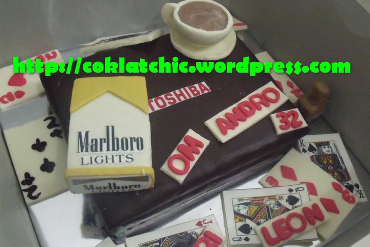 Kue ulang tahun dengan tema Cake laptop tertutup toshiba,rokok marlboro light,dan kartu model ini mulai dari harga Rp 400 ribu