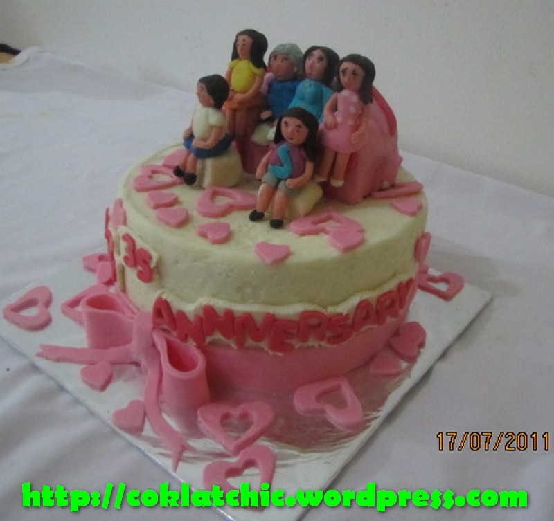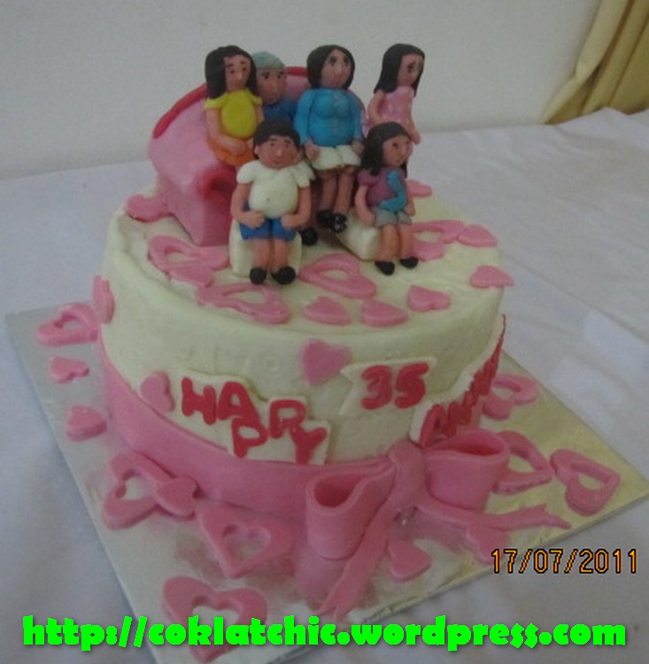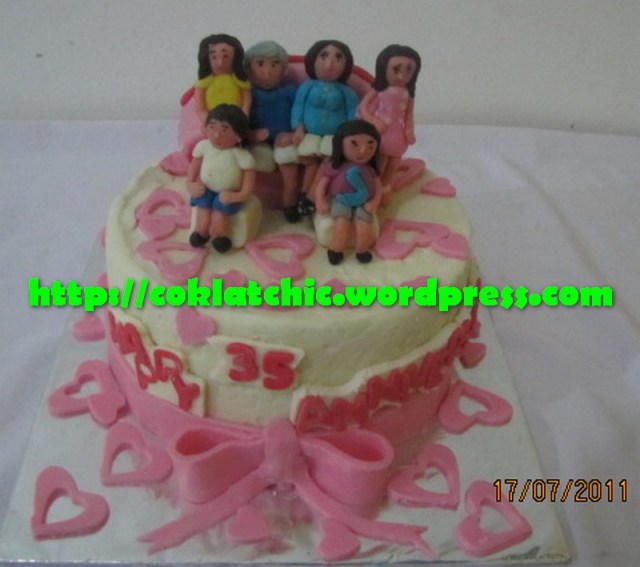 Cake Anniversary – 35th anniversary Kue anniversary model ini mulai dari harga Rp 300 ribu Terbuat dari kue yang dipahat,no styrofoam. Pelapis terbuat dari coklat bukan fondant atau sugar icing. Posted with WordPress for BlackBerry. Share this: Click to share on Facebook (Opens in new window) Facebook Like Loading... Related