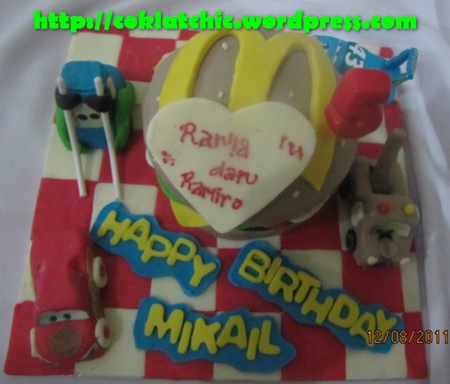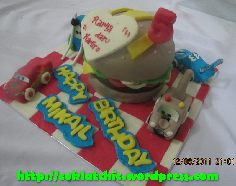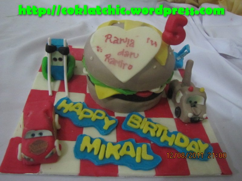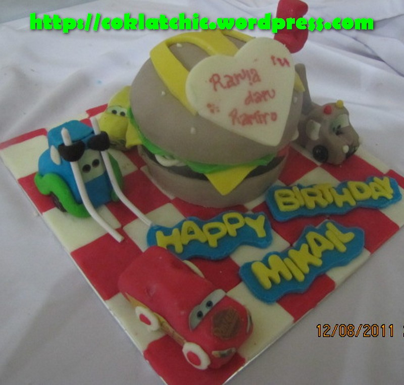Kue ulang tahun dengan tema Cake bigmac dan minicake cars model ini mulai dari harga Rp 250 ribu