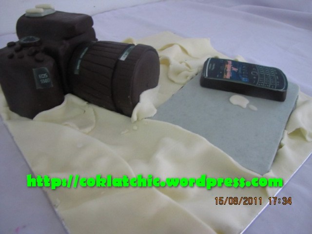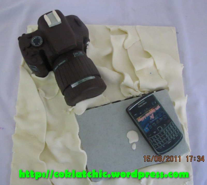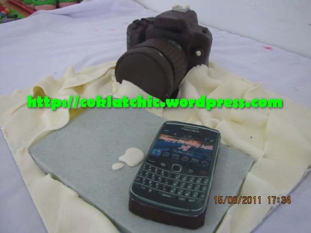 Kue ulang tahun dengan tema Cake Canon EOS 550D,blackberry 9700 dan macbook model ini mulai dari harga Rp 400 ribu
