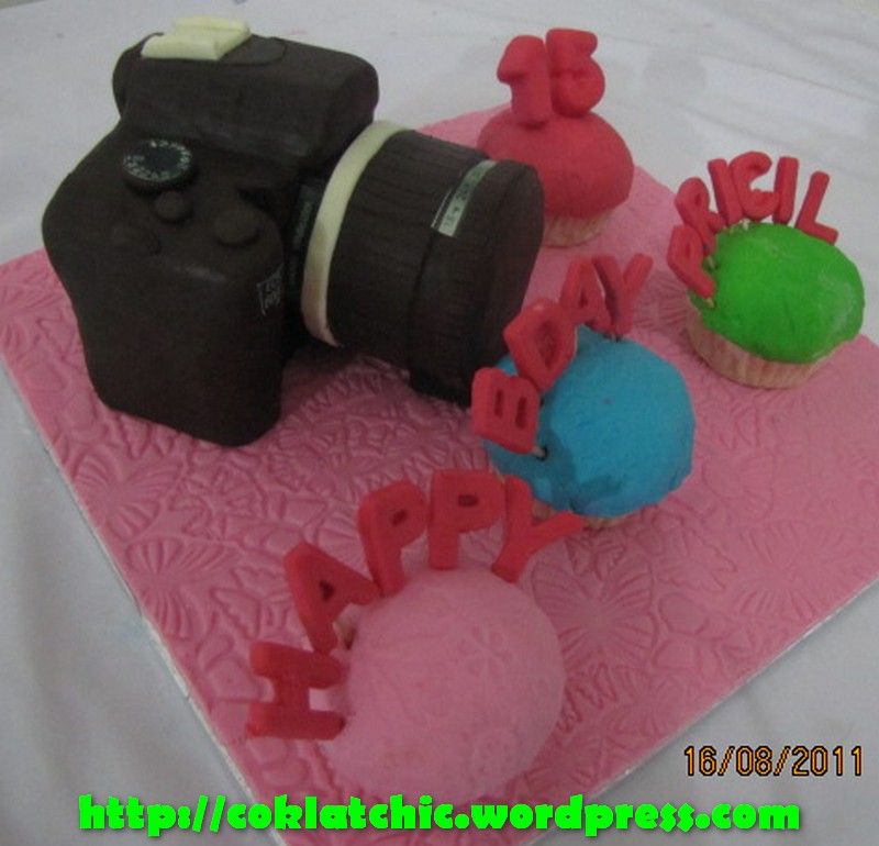 Kue ulang tahun dengan tema Cake Canon EOS 600 D dan cupcake alphabet model ini mulai dari harga Rp 375 ribu