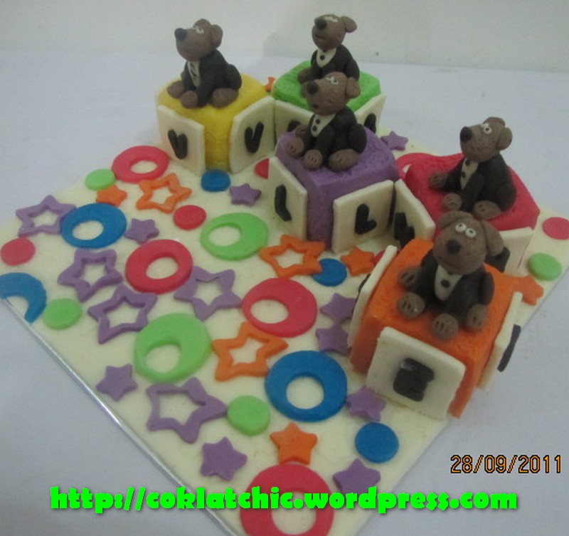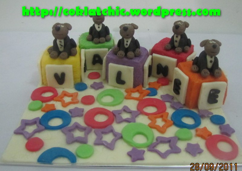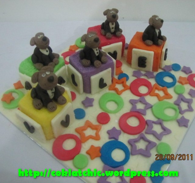Kue ulang tahun dengan tema Cake alphabet dan hush puppies model ini mulai dari harga Rp 150 ribu