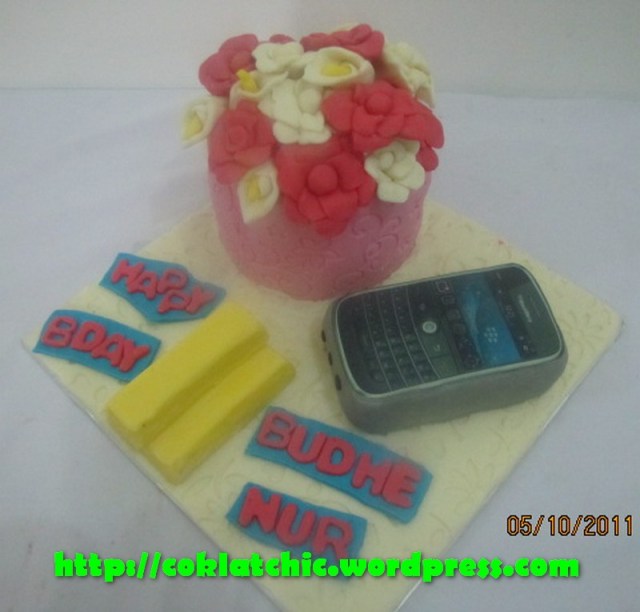 Cake set pot bunga,blackberry dan gold – BUDHE NUR Terbuat dari kue yang dipahat,no styrofoam. Pelapis terbuat dari coklat bukan fondant atau sugar icing. Posted with WordPress for BlackBerry. Share this: Share on Facebook (Opens in new window) Facebook Like Loading... Related