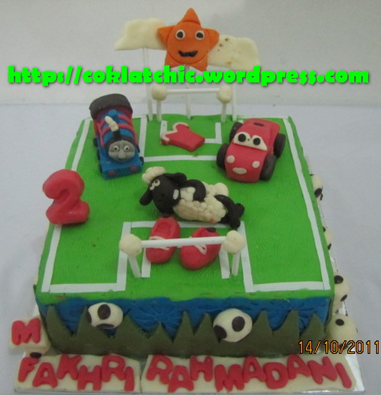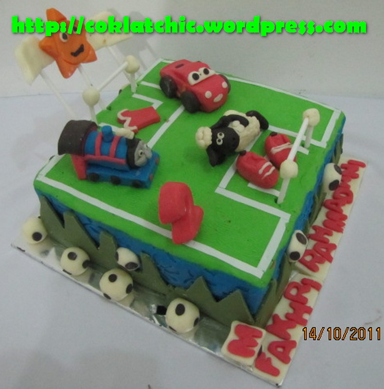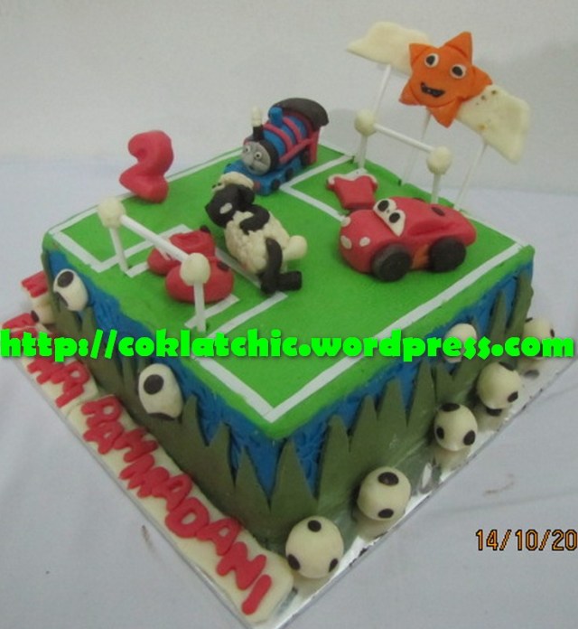Kue ulang tahun dengan tema Cake Thomas,mc Queen, shaun the sheep di lapangan bola model ini mulai dari harga Rp 300 ribu