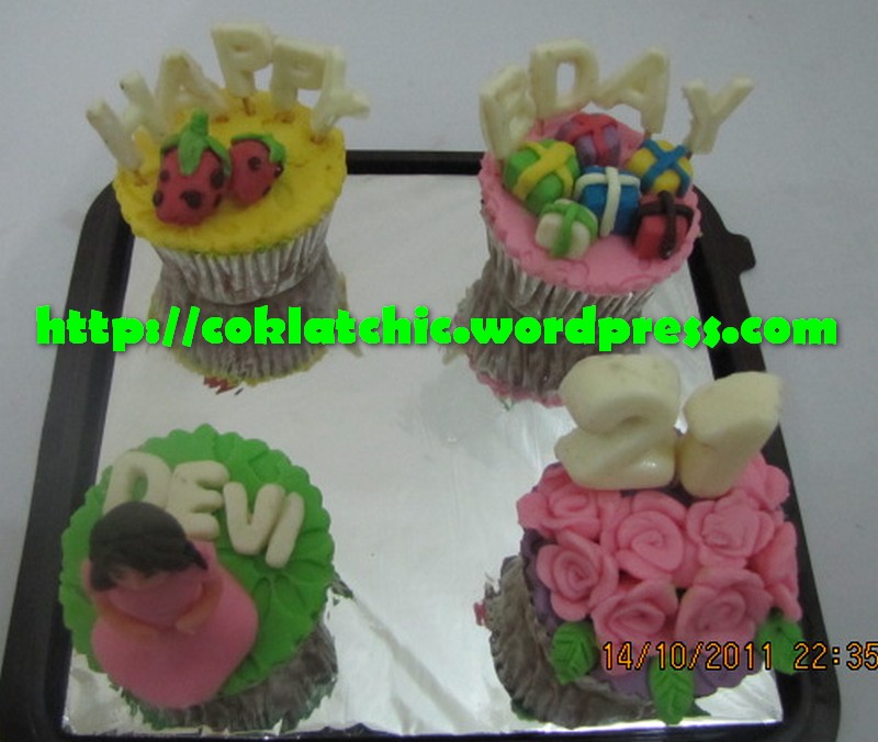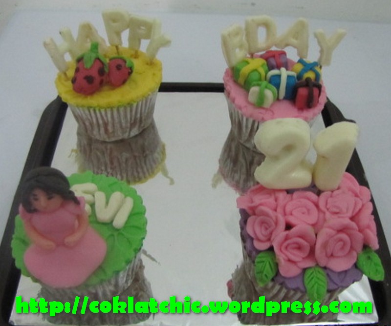 Cupcake set bunga dan kado Terbuat dari kue yang dipahat,no styrofoam. Pelapis terbuat dari coklat bukan fondant atau sugar icing. Posted with WordPress for BlackBerry. Share this: Share on Facebook (Opens in new window) Facebook Like Loading... Related