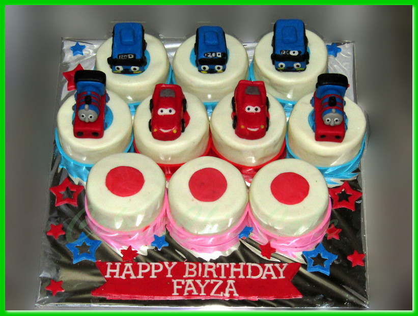 Birthday Minicake dengan tema Tayo, Thomas dan Cars Mcqueen, model tersebut mulai ukuran 6 cm , daftar harga kue ulang tahun https://coklatchiccake.com/daftar-harga-2