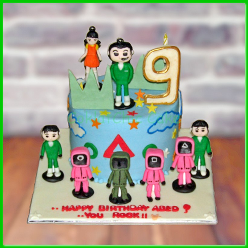 Birthday Cake dengan tema Squid Game, model tersebut mulai ukuran 15 cm , daftar harga kue ulang tahun https://coklatchiccake.com/daftar-harga-2