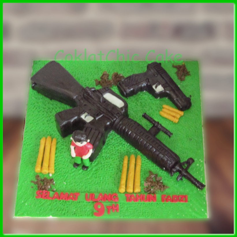 Birthday Cake dengan tema senjata, model tersebut mulai ukuran 15 cm , daftar harga kue ulang tahun https://coklatchiccake.com/daftar-harga-2
