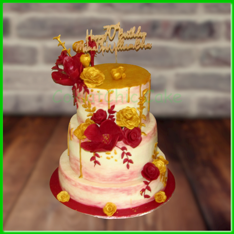 Birthday Cake dengan tema flowers gold maroon, model tersebut mulai ukuran 30 cm, 2×24 cm dan 2x 20 cm , daftar harga kue ulang tahun https://coklatchiccake.com/daftar-harga-2