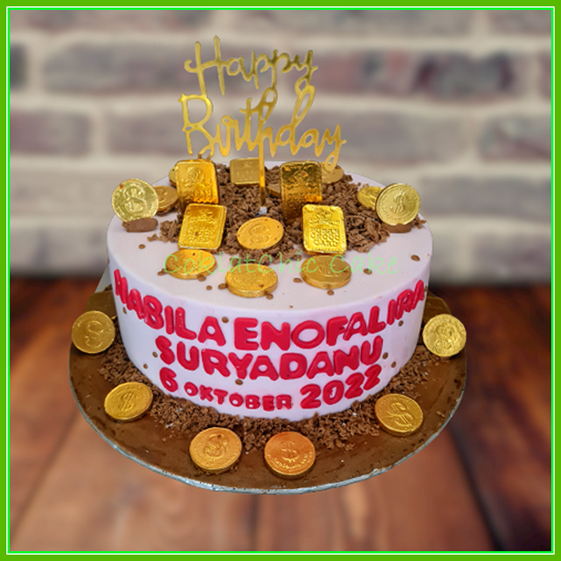 Birthday Cake uang ditarik dengan tema emas, model tersebut mulai ukuran 20 cm , daftar harga kue ulang tahun https://coklatchiccake.com/daftar-harga-2