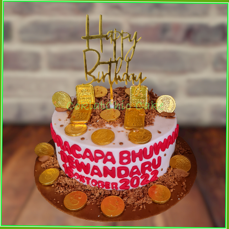 Birthday Cake uang ditarik dengan tema emas, model tersebut mulai ukuran 20 cm , daftar harga kue ulang tahun https://coklatchiccake.com/daftar-harga-2