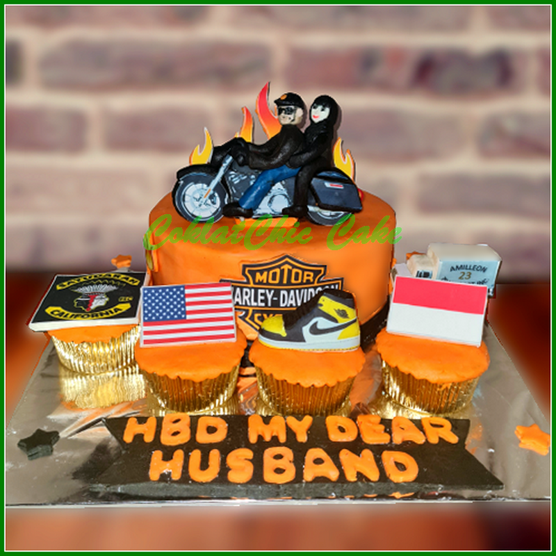 Birthday Cake dan cupcake dengan tema couple naik motor Harley Davidson, model tersebut mulai ukuran 20 cm, daftar harga kue ulang tahun https://coklatchiccake.com/daftar-harga-2