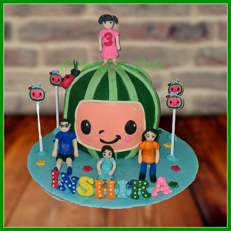 Birthday Cake dengan tema Cocomelon, model tersebut mulai ukuran 15 cm, daftar harga kue ulang tahun https://coklatchiccake.com/daftar-harga-2