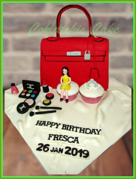 Birthday Cake dengan tema Tas dan Kosmetik , model tersebut mulai ukuran 22 cm , daftar harga kue ulang tahun https://coklatchiccake.com/daftar-harga-2