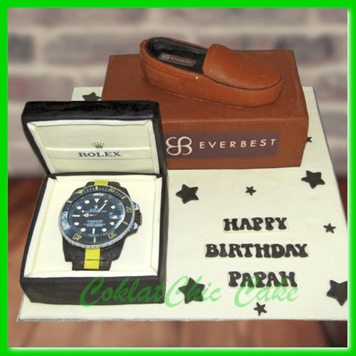 Birthday Cake dengan tema Jam Tangan dan Sepatu , model tersebut mulai ukuran 24 cm dan 15 cm , daftar harga kue ulang tahun https://coklatchiccake.com/daftar-harga-2