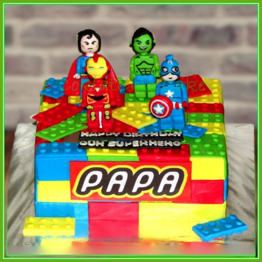 Birthday Cake dengan tema lego Superhero, model tersebut mulai ukuran 22 cm, daftar harga kue ulang tahun https://coklatchiccake.com/daftar-harga-2