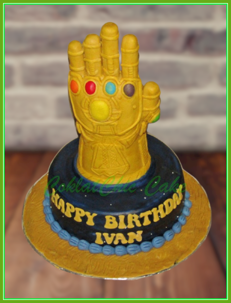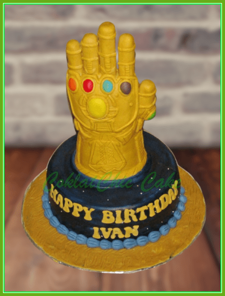 Birthday Cake dengan tema Tangan Thanos, model tersebut mulai ukuran 18 cm , daftar harga kue ulang tahun https://coklatchiccake.com/daftar-harga-2