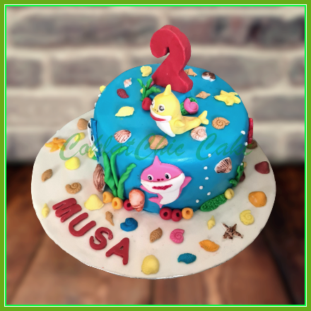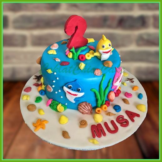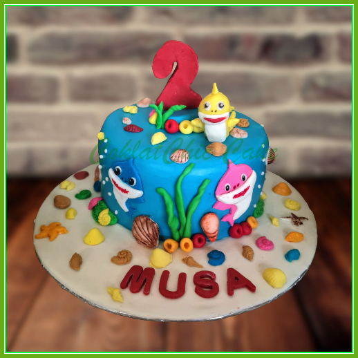 Birthday Cake dengan tema Baby Shark, model tersebut mulai ukuran 15 cm , daftar harga kue ulang tahun https://coklatchiccake.com/daftar-harga-2