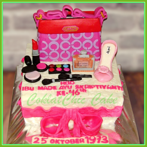 Birthday Cake dengan tema tas bag and heel, model tersebut mulai ukuran 20 cm , daftar harga kue ulang tahun https://coklatchiccake.com/daftar-harga-2