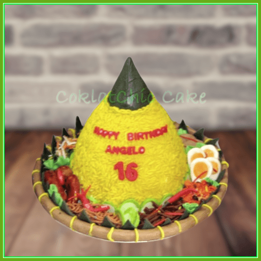 Birthday Cake dengan tema Tumpeng nasi kuning, model ini mulai ukuran 18 cm, daftar harga kue ulang tahun https://coklatchiccake.com/daftar-harga-2