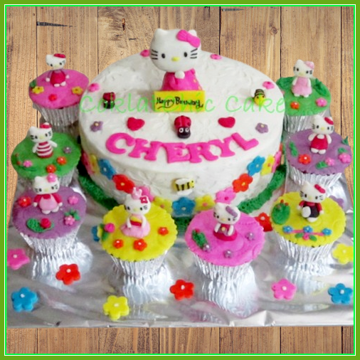 Birthday Cake dan cupcake dengan tema Hello Kitty, model ini mulai ukuran 20 cm, daftar harga kue ulang tahun https://coklatchiccake.com/daftar-harga-2