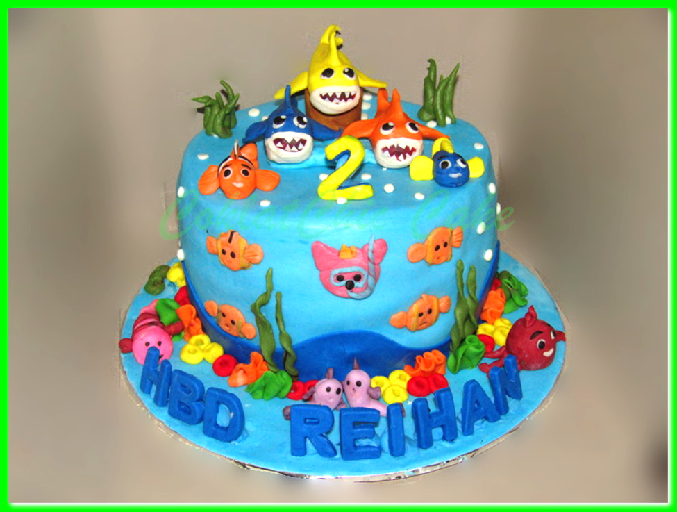 Birthday Cake dengan tema Baby Shark, model tersebut mulai ukuran 15 cm , daftar harga kue ulang tahun https://coklatchiccake.com/daftar-harga-2