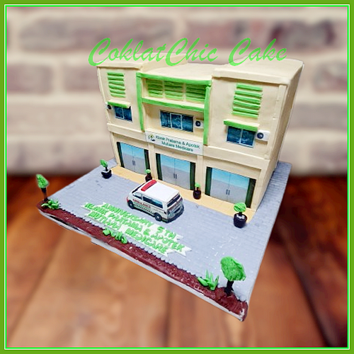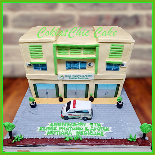Birthday Cake dengan tema Gedung klinik, model tersebut mulai ukuran 30 cm , daftar harga kue ulang tahun https://coklatchiccake.com/daftar-harga-2