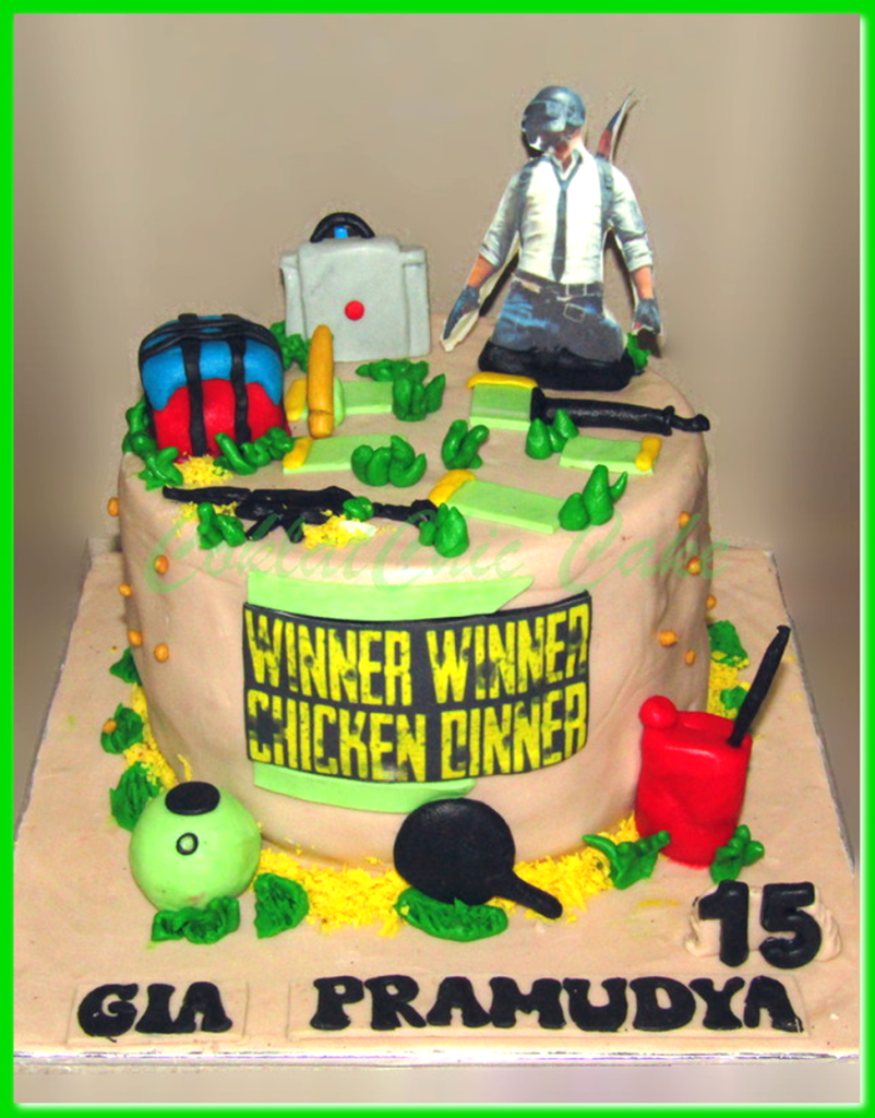 Birthday Cake dengan tema PUBG, model tersebut mulai ukuran 15 cm , daftar harga kue ulang tahun https://coklatchiccake.com/daftar-harga-2